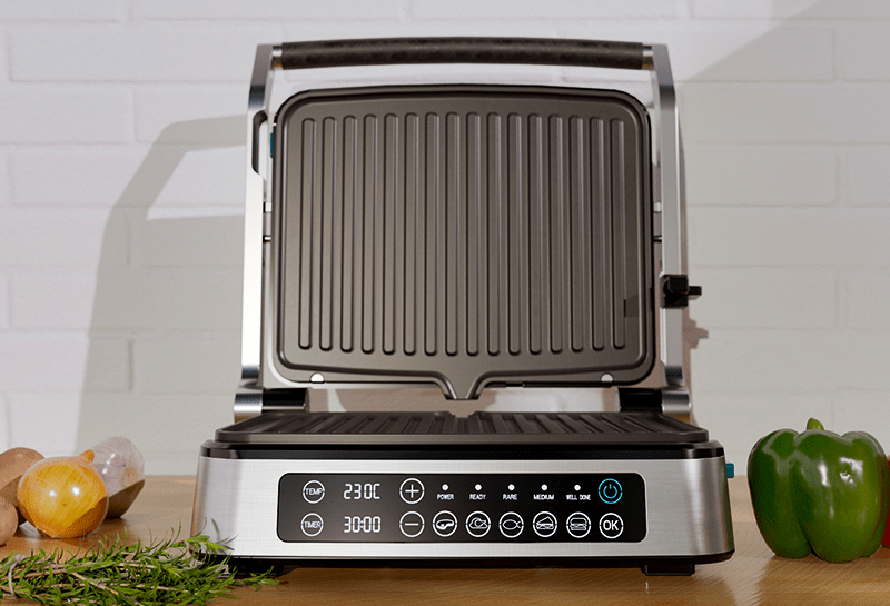 Selecciona entre 5 programas automáticos en su panel digital: bife de carne, pollo, pescado, sándwich y hamburguesa, o utiliza el modo manual con sus 4 ajustes de cocción para asar una variedad de ingredientes. Todo con un simple toque de botón.