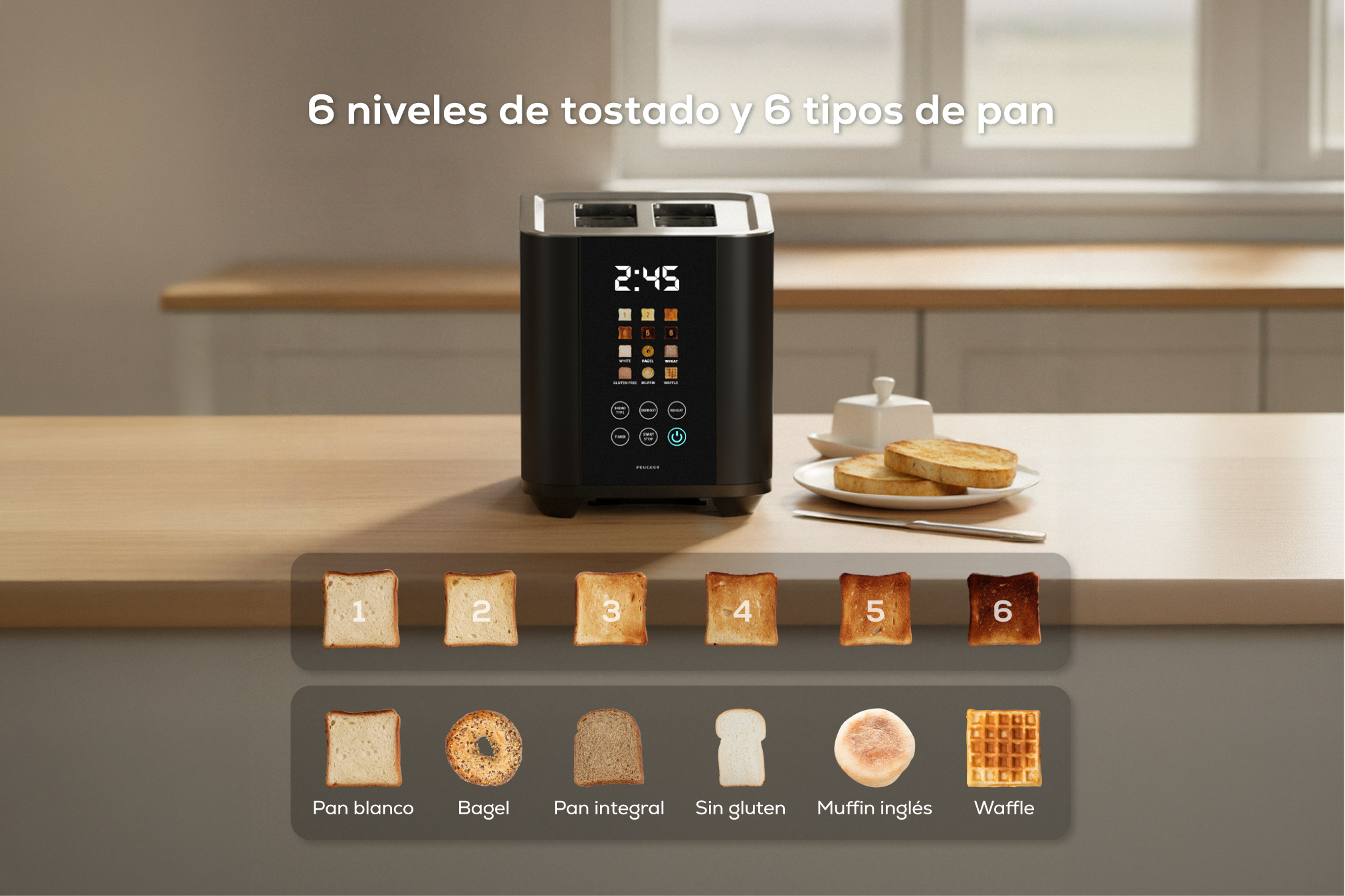 Además, incorpora 6 programas específicos según el tipo de pan —Blanco, Bagel, Trigo, Sin Gluten, Muffin y Waffle— ajustando automáticamente el ciclo de calor para adaptarse a cada textura y densidad. Un tostado inteligente, uniforme y pensado para que cada desayuno salga perfecto.