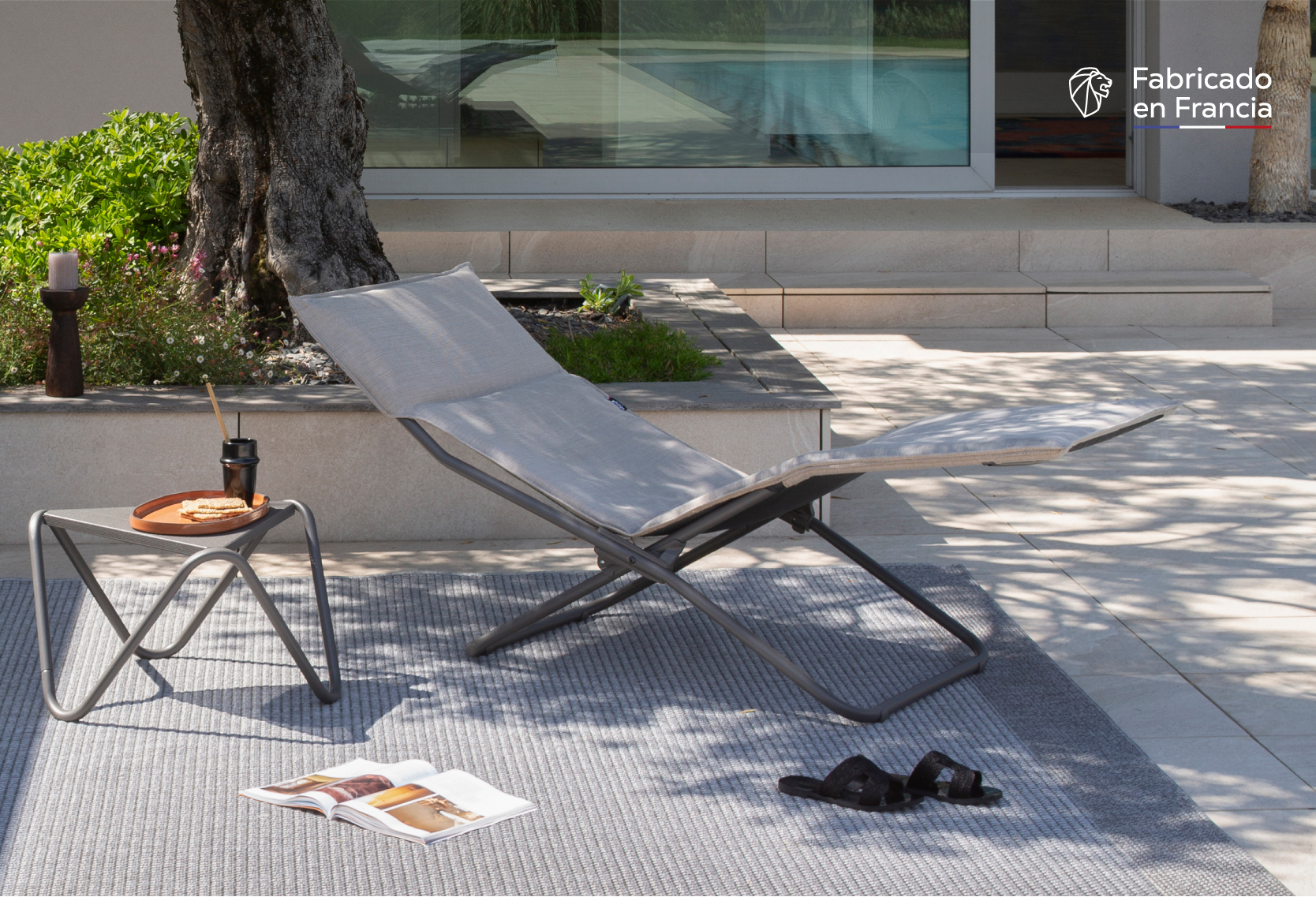 La reposera Bayanne invita al bienestar, gracias a su estructura de dimensiones generosas que se ajusta a la forma del cuerpo. Dispone de un sistema de articulación patentado que permite adoptar la posición «gravedad cero», con las piernas ligeramente por encima de la altura del corazón, la posición de relajación absoluta. Su silueta pulida y su mullido acolchado seducen a cualquiera; encaja a la perfección en cualquier sitio, junto a la piscina o en la terraza. Fabricada en Francia con materiales de calidad y respetuosos con el medio ambiente, la reposera Bayanne cuenta con 5 años de garantía y ha recibido la etiqueta LONGTIME®, que garantiza su durabilidad