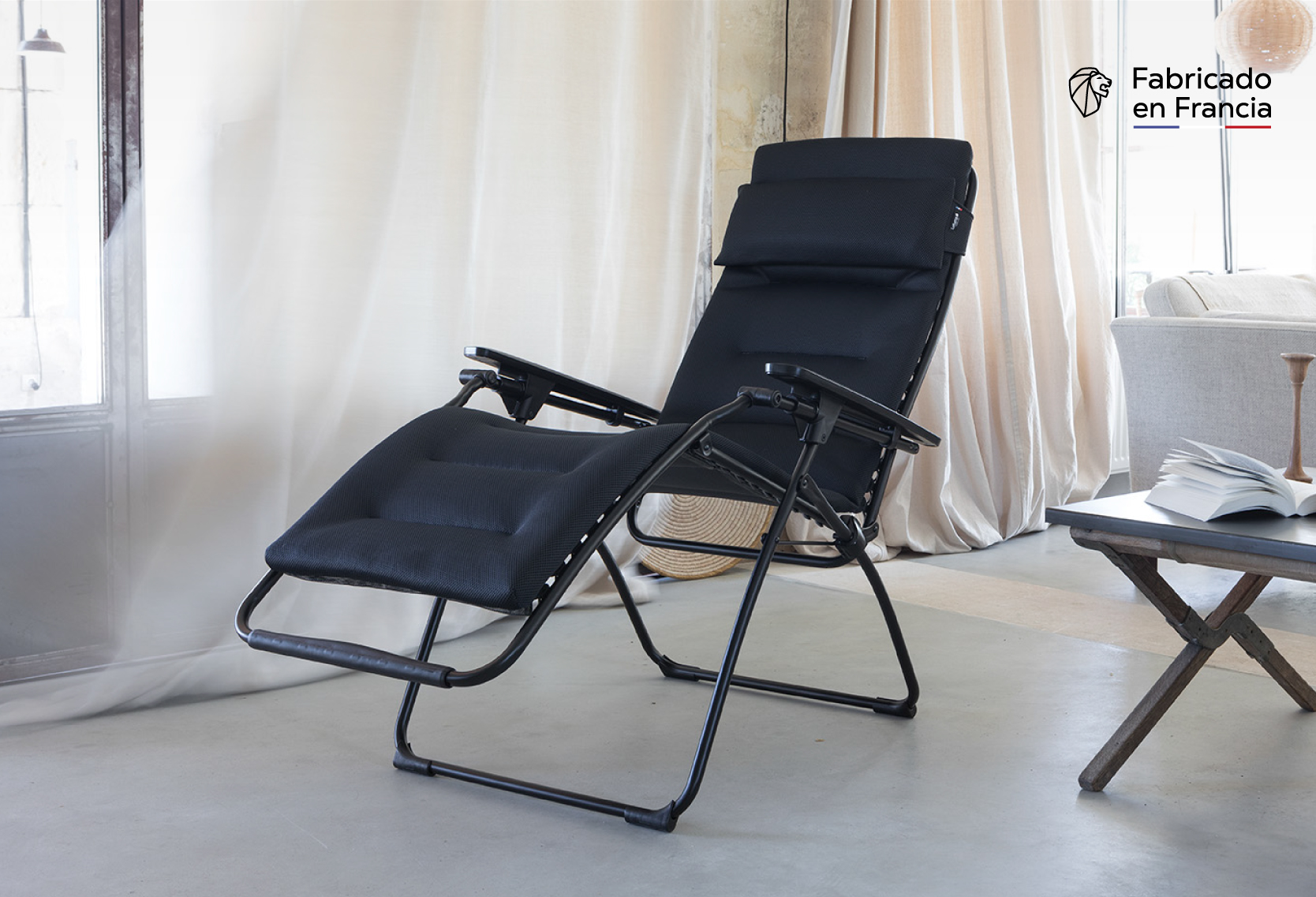 El sillón de relax Futura Air Comfort®, podrá disfrutar de la suave comodidad de una reposera acolchada tanto en interiores como en exteriores. Este modelo es la reposera ideal para relajarse, ya que fue diseñado para ofrecer la posición ideal de relajación en formato de silla plegable. El principio fundamental es colocar las piernas ligeramente por encima del corazón para optimizar su descanso. Comodidad inigualable en la terraza, el jardín o simplemente en el salón. Fabricada en Francia con materiales de calidad y respetuosos con el medio ambiente, el sillón de relax Futura cuenta con 5 años de garantía y ha recibido la etiqueta LONGTIME®, que garantiza su durabilidad.