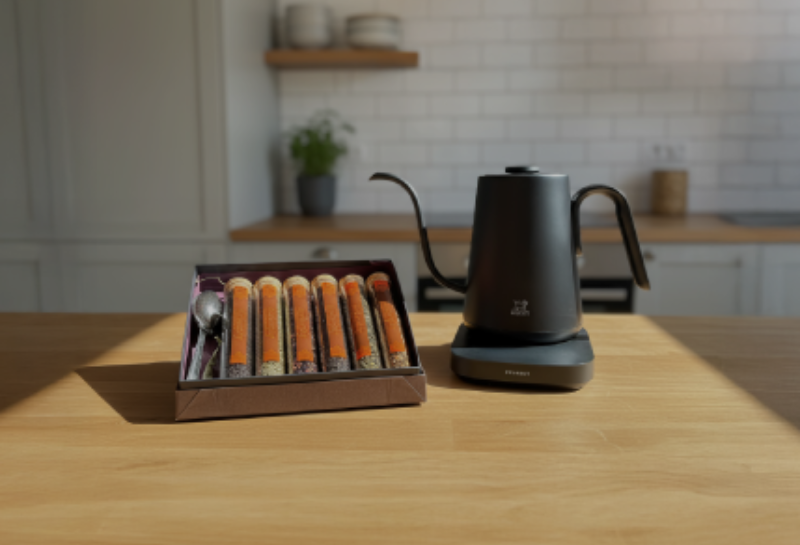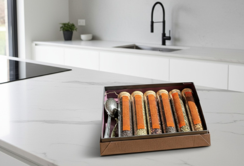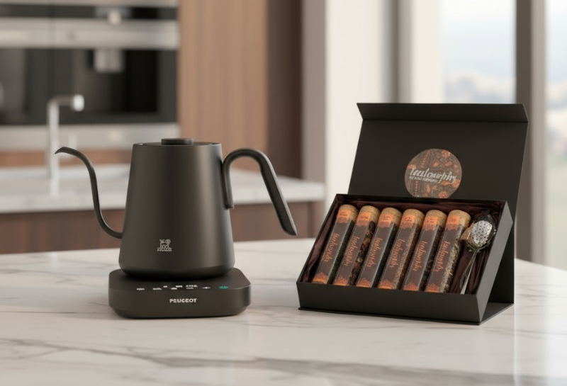 Seis blends icónicos de Tealosophy en tubos de degustación, cuchara infusora y la pava eléctrica Brest.